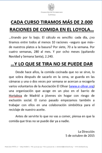 El problema de la comida que se tira en nuestro comedor, la que no se puede recuperar porque se sirve en los platos y no se consume, nos viene preocupando desde hace varios años, pero es muy difícil de atajar. En alguna otra ocasión, en cursos pasados, hemos sacado notas desde Dirección haciendo cálculos de la comida que se desperdicia en el colegio mayor al año, pero no se ha notado reacción importante alguna.
