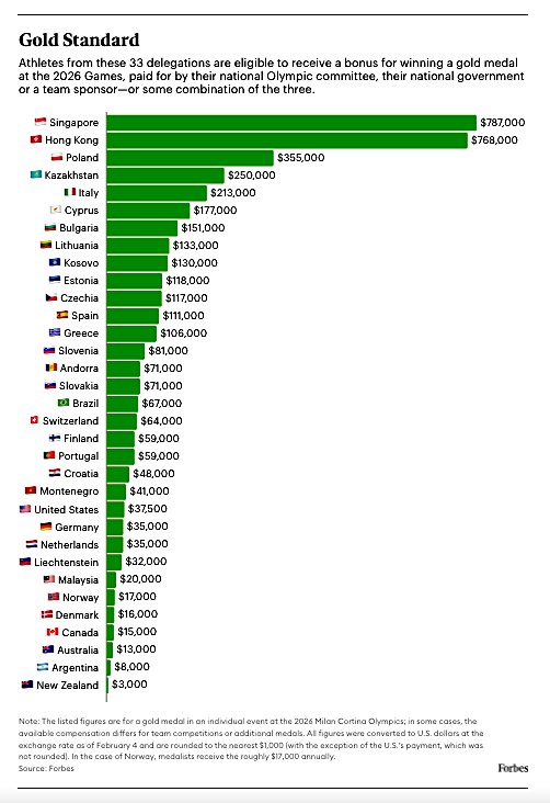 Antes del inicio oficial de los Juegos de Milán-Cortina, que arranca con la ceremonia de apertura el viernes, Forbes contactó a los comités olímpicos nacionales y a los ministerios de deportes de los gobiernos de los 92 países y territorios que participan. Confirmó que al menos 37 de ellos ofrecen bonificaciones en efectivo a los atletas que obtengan medallas.